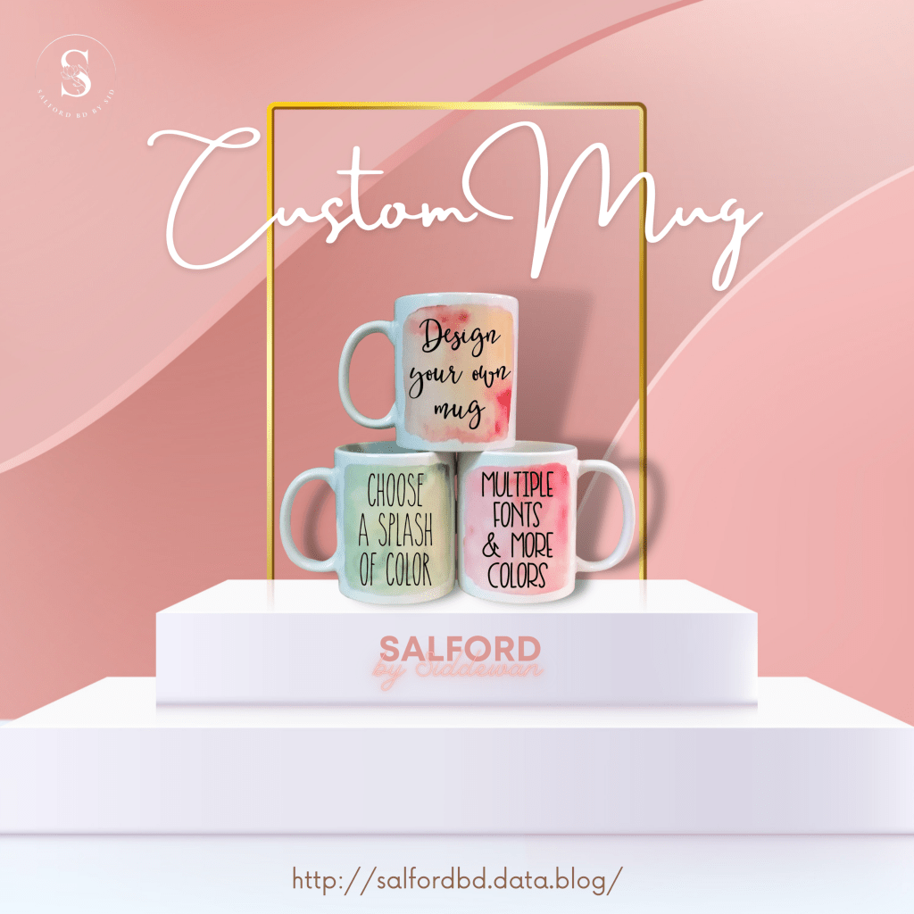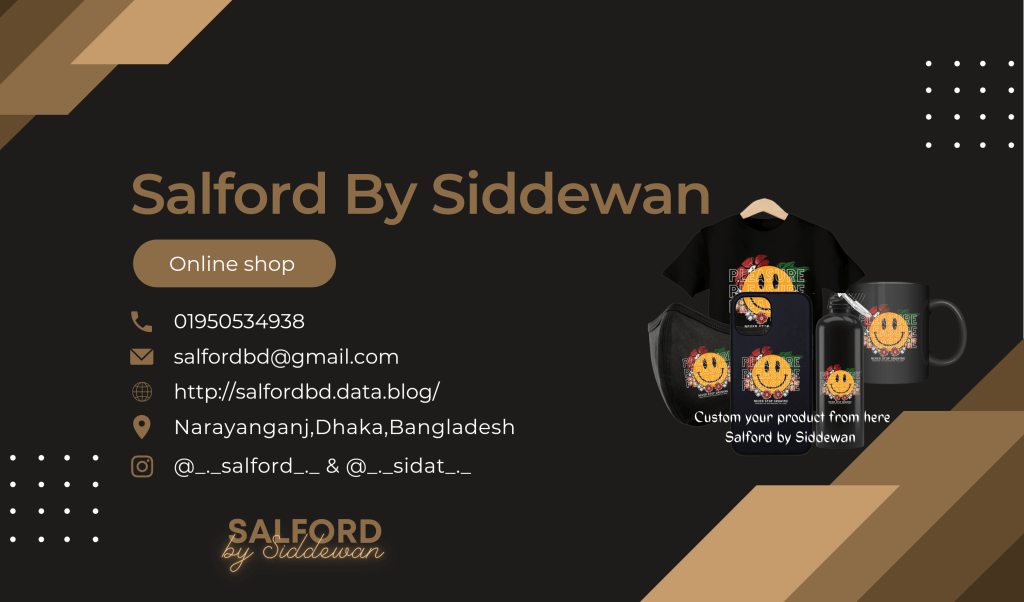 Are you searching for customized products? So here is the solution. Don’t think about the quantity as you can place your order even a single piece of your productShare your design with SALFORD and get a own designed item.Our available custom items are:Mobile Cover Magic Mug. T-shirt Mask Polo T-shirt Mug Popsocket Plate Badge • Pocket pictures Jersey. Cap. Rag Day T-shirt T-shirts for any occasion etcIf your quantity is huge then inbox us for details.Prices and details are mentioned Or you need to dm for price.To place your order: Call us: 01950534928 Inbox us on WhatsApp : 01950534928Delivery charge time: Inside dhaka: 80tk (Home Delivery) 2/3days Outside dhaka 100tk (Home)Delivery) 4/5days SA Paribahan Courier Service: 150tk Sundarban Courier Service: 130tk•Delivery Timing: 3-7 Days (Depends on stock availability & Design)For more enquiry contact us: Hotline: 01950534928 Mail: salfordbd@gmail.com Instagram: @_._salford_._N.B: Colour maybe vary ondifferent electronic devices or different resulations. Check again. before place your order.We have the best collection with the best price in town. Lets set the trend with SALFORD and explore.